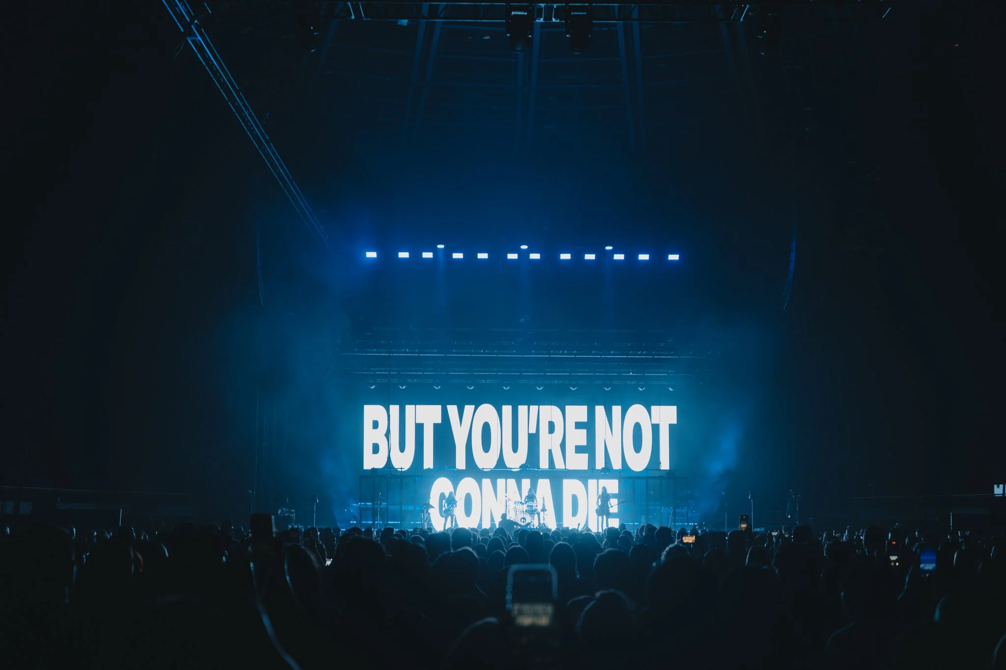 the design featured a flown “sign” which interacted with the band over the course of the show, and a multi-layered lighting and video design