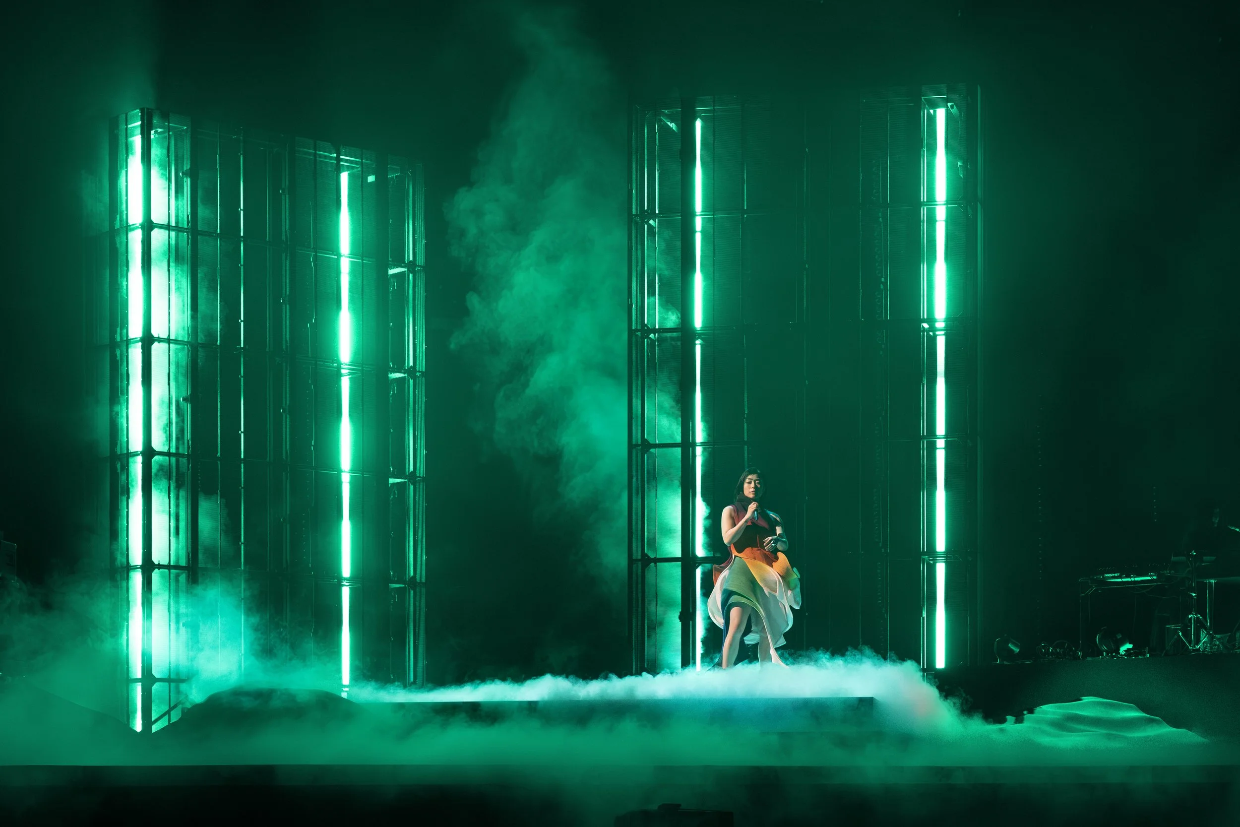 Under the impeccable creative direction of Jason Ardizzone-West, a monolithic other-worldly landscape takes over this 110’ wide arena stage, only possible in Japanese arenas. Initially inspired by retro machines, 9x cubed video columns arise from CNC carved foam dunes.